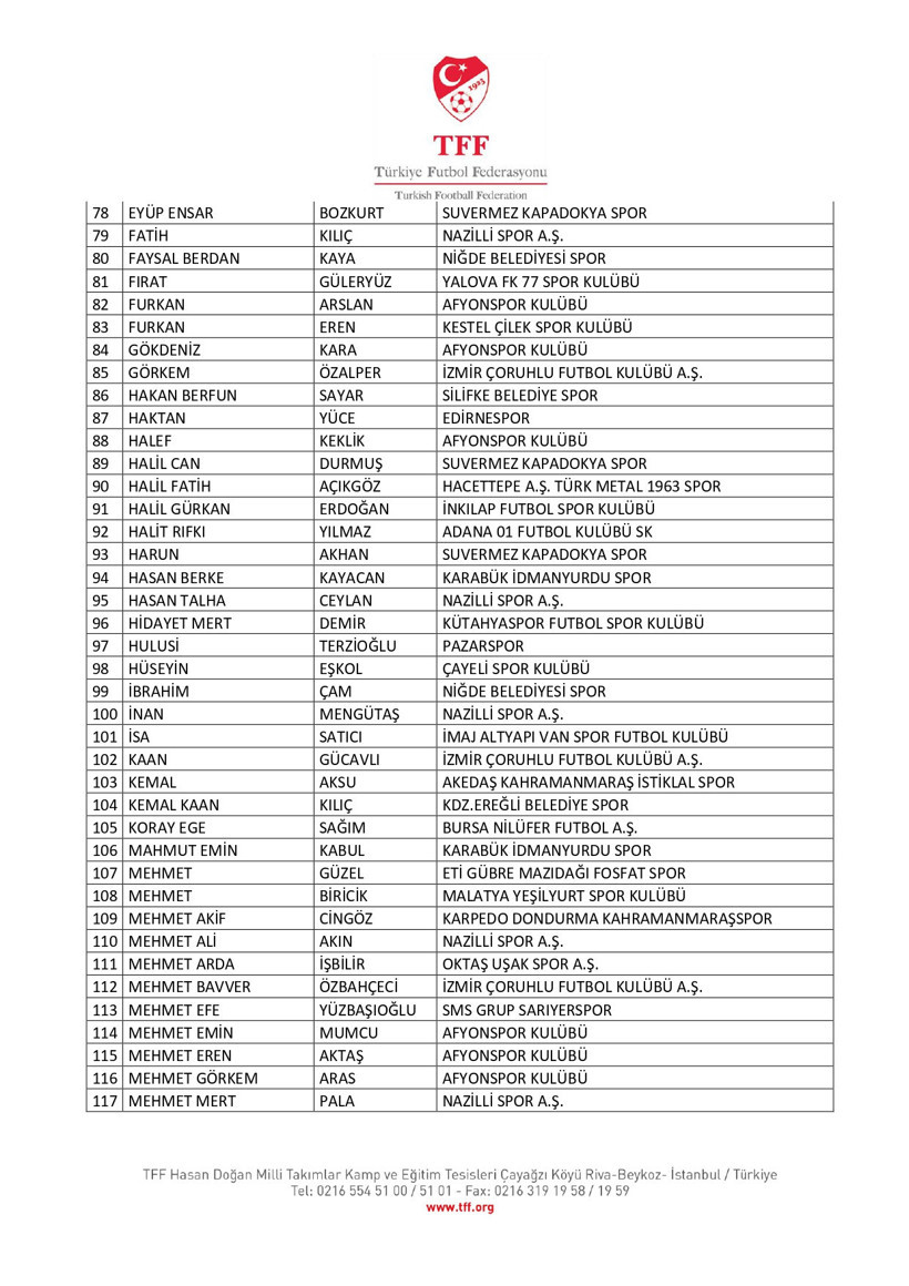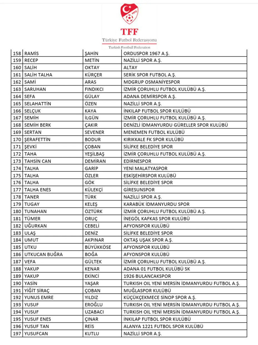 TFF’den yapılan açıklamada “Türkiye Futbol Federasyonu’nca profesyonel liglere yönelik olarak yürütülen bahis soruşturması kapsamında 10.11.2025 tarihinde PFDK’ya sevk edilen 1024 futbolcunun haricinde profesyonel liglerde yer alan kulüplerin “A Takım” listelerinde yer alan veya ilgili lig statüleri uyarınca esame listesine yazılarak profesyonel müsabakalarda oynatılabilen amatör statüdeki 658 futbolcudan bahis oynadığı tespit edilen aşağıdaki 197 futbolcunun Futbol Disiplin Talimatı’nın 57. maddesi uyarınca 08.12.2025 tarihinden itibaren tedbirli olarak PFDK’ya sevk edilmesine karar verilmiştir” denildi.